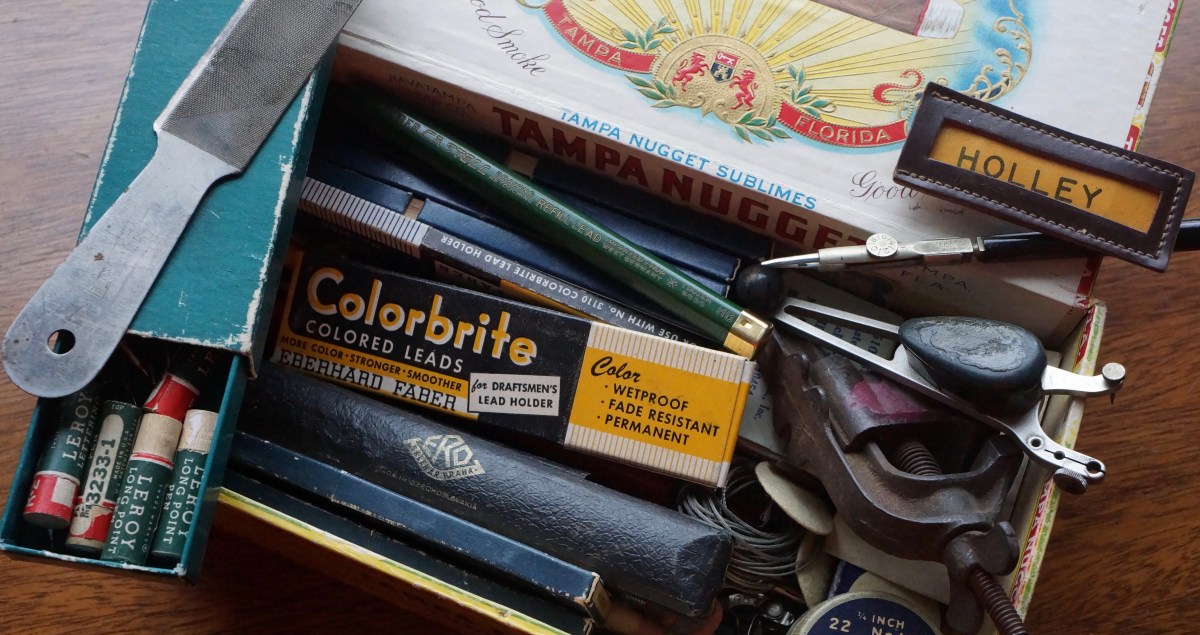We sorted and despaired of a life and its remains. We each salvaged. For me: draftsman tools, kept in cigar boxes, decades untouched. His several fuse and artillery patents, never noted in our childhood, his Patterson High School yearbook. The stuff I want to define the intent of my father.
